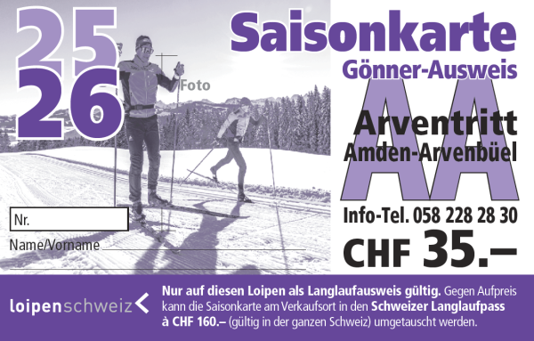 Die örtliche Saisonkarte für die wunderschönen Loipen im Arvenbüel. Auf rund 7 km Länge bietet die Loipe „Arventritt“ eine erstaunliche landschaftliche Vielfalt, von Wäldern über romantische Bäche und Täler bis zum wundervollen Panoramablick vom Chapf – das perfekte Langlauferlebnis für traumhafte Winterstunden.